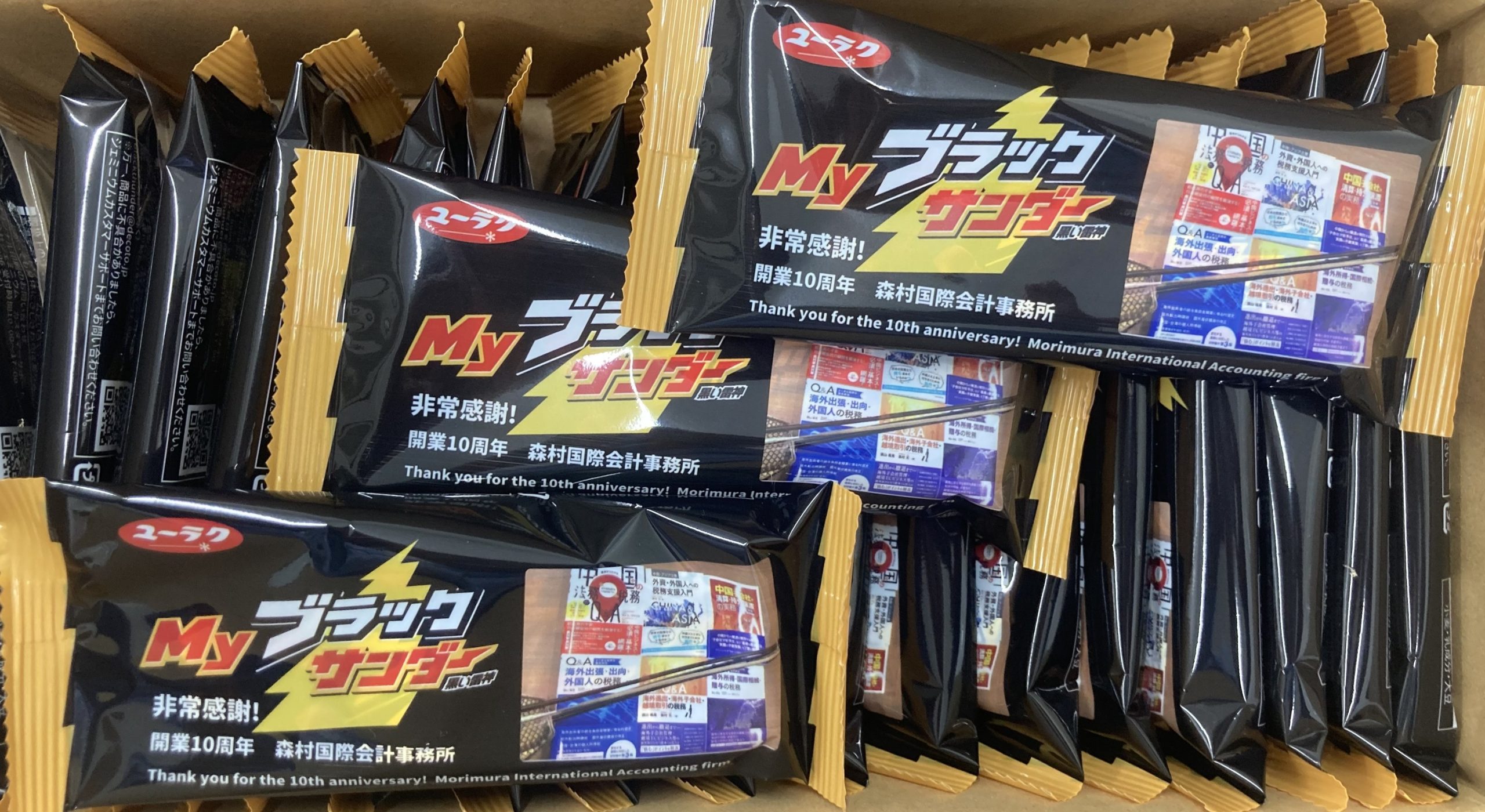 開業10周年を記念しまして、上記の10周年記念オリジナル・ブラックサンダーを作成いたしました。お会いする機会がある方には、順次進呈申し上げるようにいたします。